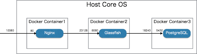 - "link" を使うことにより、nginx は環境変数で glassfish のポートを知ることができる。同様に、glassfish は、postgresql のポートを知ることができる。