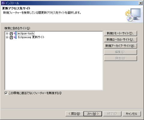 すると、pluginsの更新サイトが登録されましたので、チェックをして[次へ(N)]を押します。