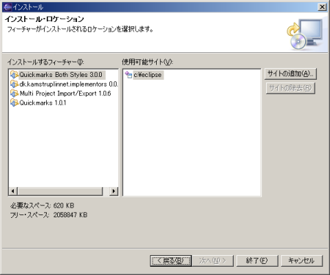 を選択すると、更新サイトを利用したpluginsのインストールウィザードが始まります。