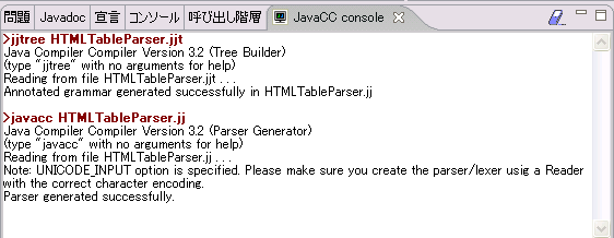 HTML文書のTABLEタグの内容を取得するHTMLTableParser?.jjを作成します。ここではとりあえず<TD>タグの中身をSystem.outに出力します(データの取り込みは後述するJTBを使ってこのプログラムを拡張して行います)。