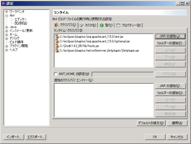 [ウィンドウ(W)]-[設定(P)]-[Ant]-[ランタイム]