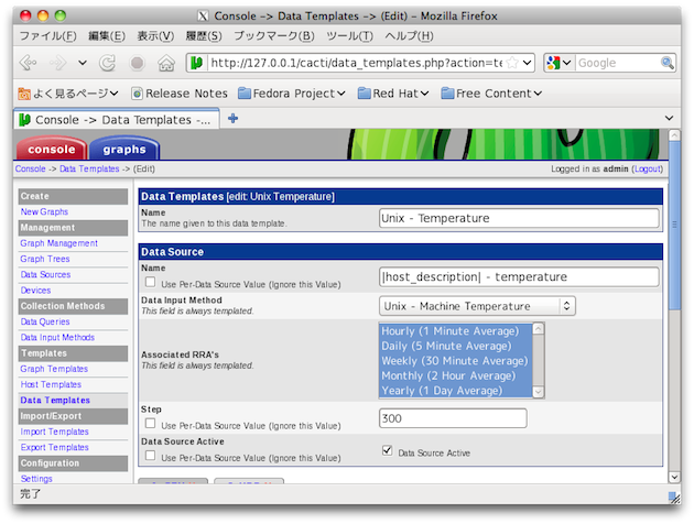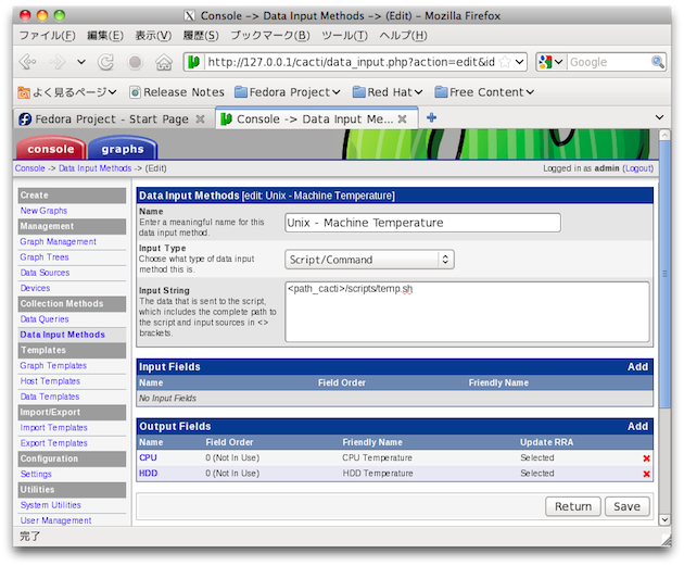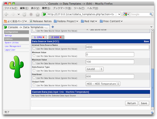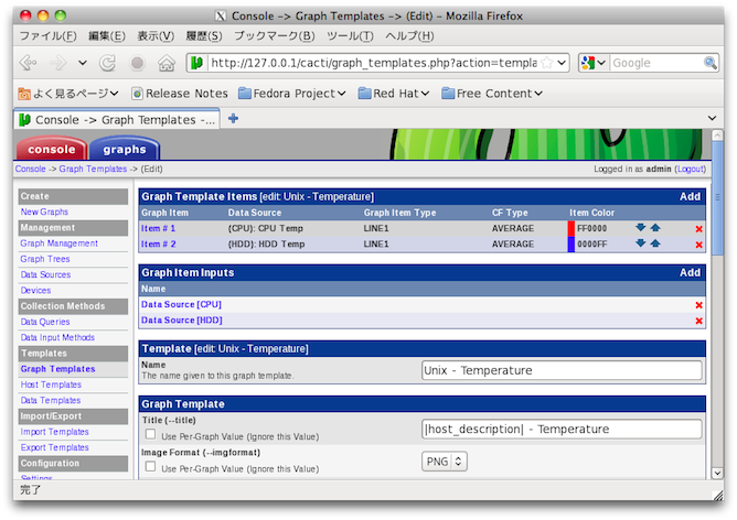 $ sudo /var/lib/cacti/scripts/temp.sh CPU:49 HDD:51$改行しないのがミソ