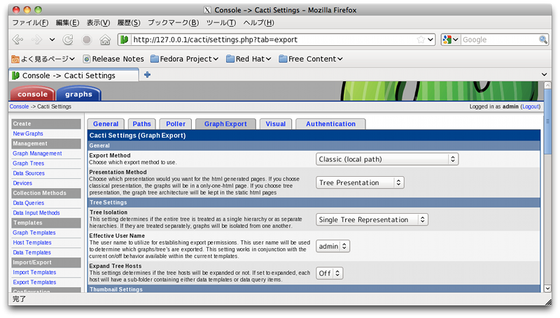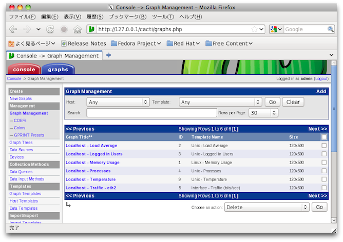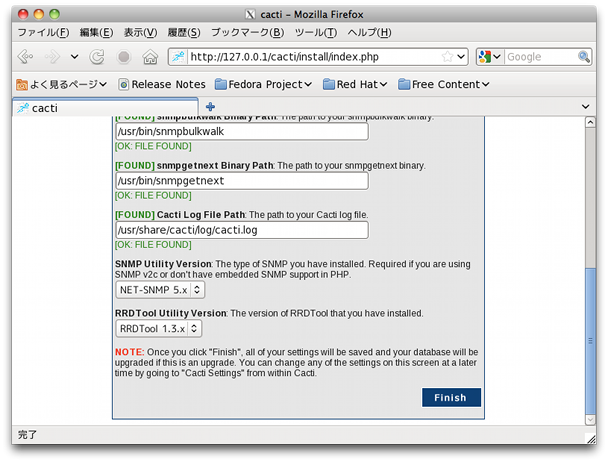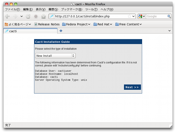 $ mysql -u root -p Enter password: mysql> create database cacti; Query OK, 1 row affected (0.26 sec) mysql> grant all privileges on cacti.* to cactiuser@localhost identified by 'cactiuser'; Query OK, 0 rows affected (0.34 sec) mysql> exit Bye $ mysql -u cactiuser -p cacti < /usr/share/doc/cacti-0.8.7f/cacti.sql Enter password: