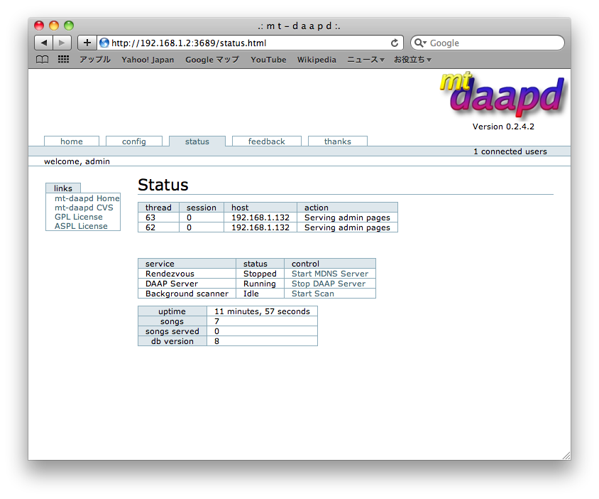 # /etc/init.d/mt-daapd start DAAP サーバーを起動中: [ OK ]