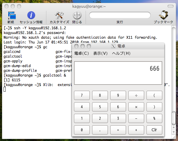 $ ssh kagyuu@192.168.1.2 The authenticity of host '192.168.1.2 (192.168.1.2)' can't be established. RSA key fingerprint is 32:9d:9c:a2:fd:50:f5:e3:ba:78:64:36:12:86:de:0f. Are you sure you want to continue connecting (yes/no)? yes Warning: Permanently added '192.168.1.2' (RSA) to the list of known hosts. kagyuu@192.168.1.2's password: [kagyuu@orange ~]$