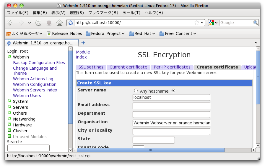 - [Webmin Configuration]-[SSL Encryption] にアクセスすると、SSL のモジュールが足りないと言われる。"download and install" をクリックすると yum で perl-Net-SSLReay がインストールされる