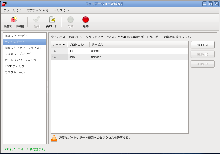 $ sudo /usr/bin/system-config-firewall※ iptable だけは、コマンドで設定は勘弁