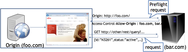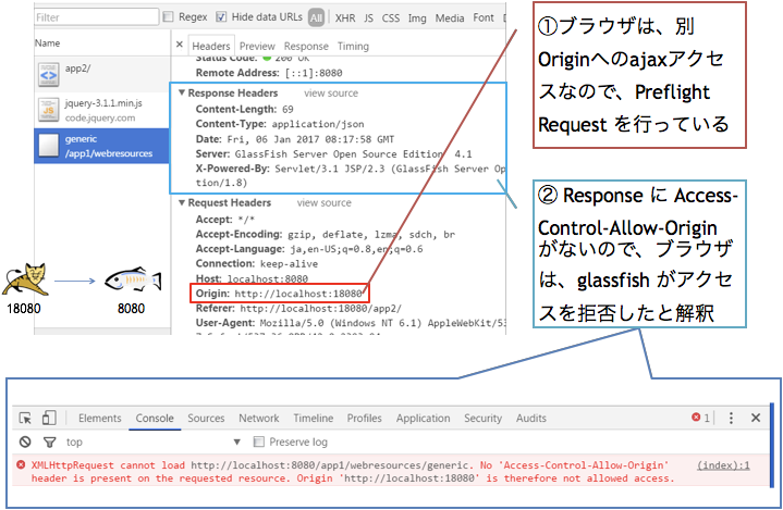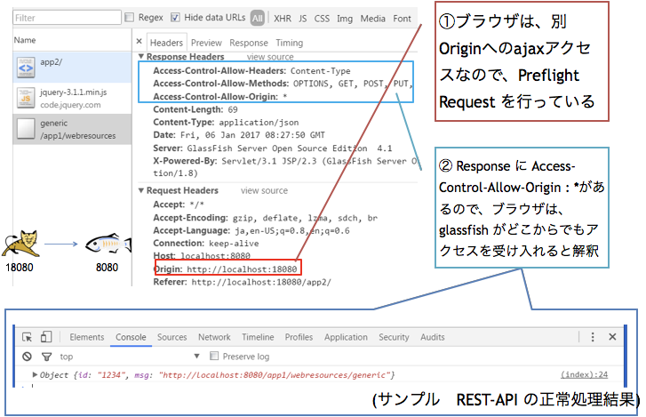 - 上記の例では、全ての Origin 全ての Method 全ての Content-Type の Ajax アクセスを受け入れるように、Preflight Request に対して Response を返している