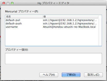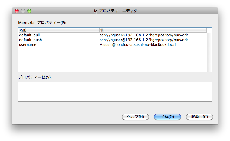 [hguser@orange ourwork]$ hg history チェンジセット: 0:9e3b9f7206c9 タグ: tip ユーザ: Atsushi@hondou-atsushi-no-MacBook.local 日付: Fri Jul 15 00:01:14 2011 +0900 要約: Initial Versionssh のログインは hguser ユーザだけど、Mac (クライアント) 側の Atsushi で commit されている