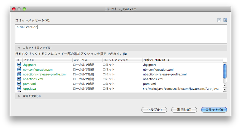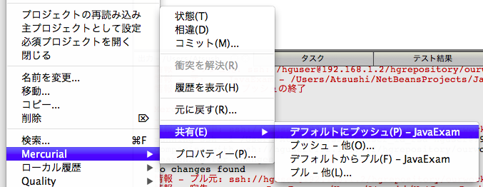 Mercurial プッシュ -------------- 情報 - プッシュ中: ssh://hguser@192.168.1.2/hgrepository/ourwork ... 情報 - プッシュするチェンジセット: changeset : 0:9e3b9f7206c9 author : Atsushi@hondou-atsushi-no-MacBook.local 日付 : Fri Jul 15 00:01:14 JST 2011 summary : Initial Version pushing to ssh://hguser@192.168.1.2/hgrepository/ourwork searching for changes remote: チェンジセットを追加中 remote: マニフェストを追加中 remote: ファイルの変更を追加中 remote: 1 のチェンジセット(8 の変更を 8 ファイルに適用)を追加 情報 - プッシュ先: ssh://hguser@192.168.1.2/hgrepository/ourwork 情報 - 元: JavaExam - /Users/Atsushi/NetBeansProjects/JavaExam 情報: Mercurial プッシュの終了