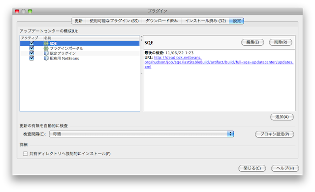 1. [ツール]-[プラグイン]-[設定] で、SQE の配布サイト( http://deadlock.netbeans.org/hudson/job/sqe/lastStableBuild/artifact/build/full-sqe-updatecenter/updates.xml )を追加