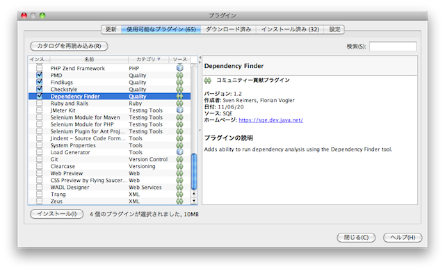 2. [使用可能なプラグイン] から、Find Bugs、PMD、Check Style、Dependency Finder をインストール