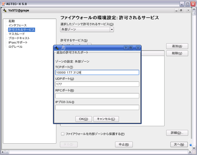 - 最後にYastで、ファイアーウォールがPort10000を通すように設定します。