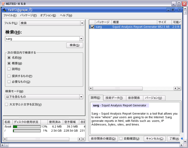 - [Yast]-[ソフトウェアのインストール/削除]でSargをインストールします