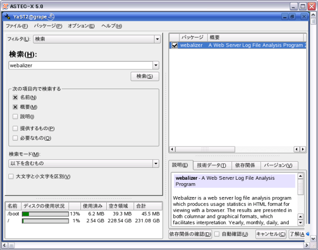 - [Yast]-[ソフトウェアのインストール/削除]でWebalizerをインストールします