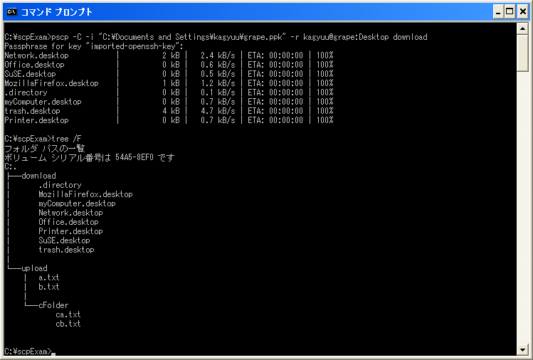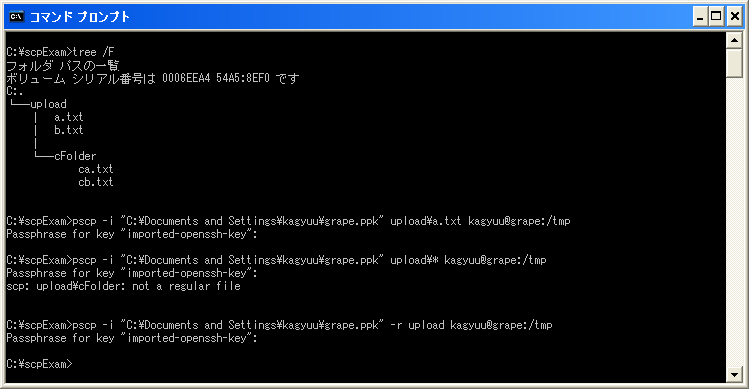 - pscp -i [秘密鍵] [アップロード元] [ユーザ]@[サーバ]:[アップロード先]