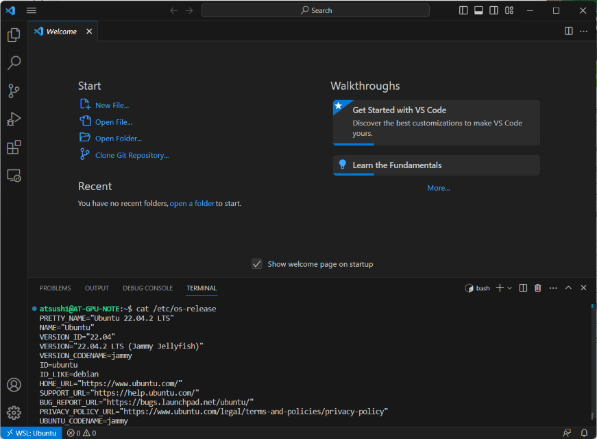 - 次回起動時にも WSL2/Ubuntu にリモート接続するモードで起動する。Windows ネイティブに使いたい場合には、右下の WSL:Ubuntu を Off にする