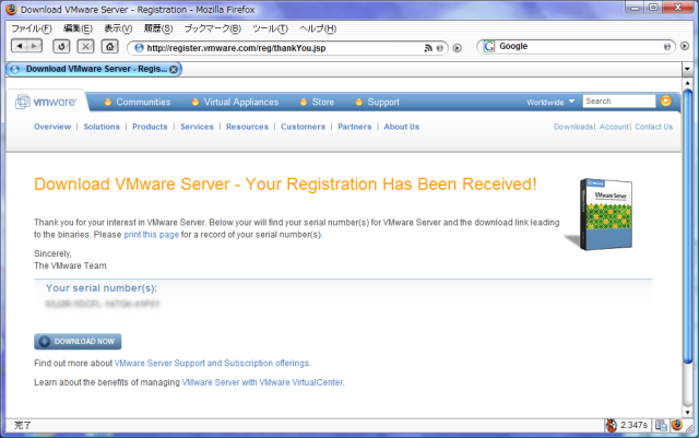 - シリアル番号をメモしておいて、VMWare Server をダウンロードする。